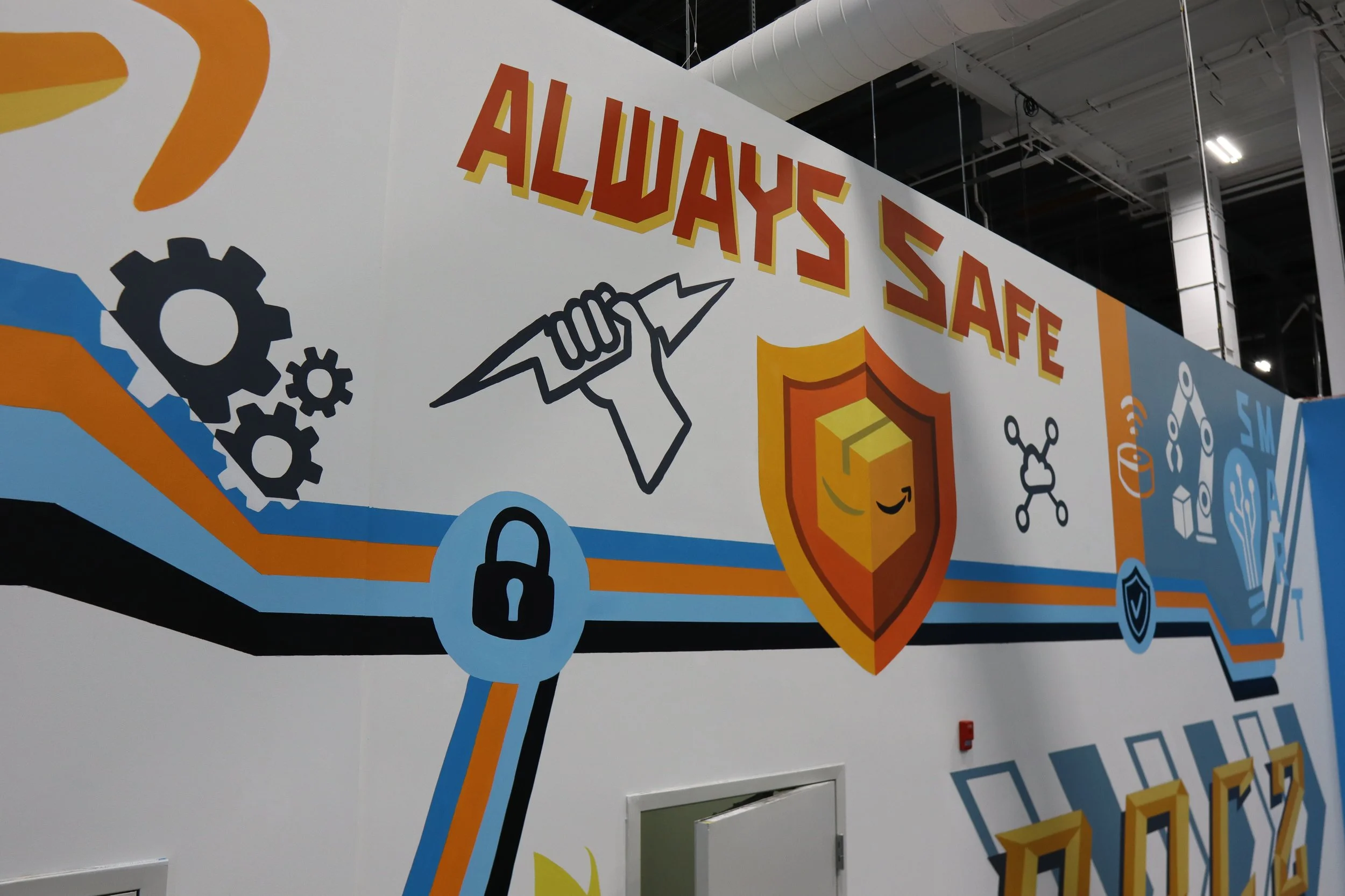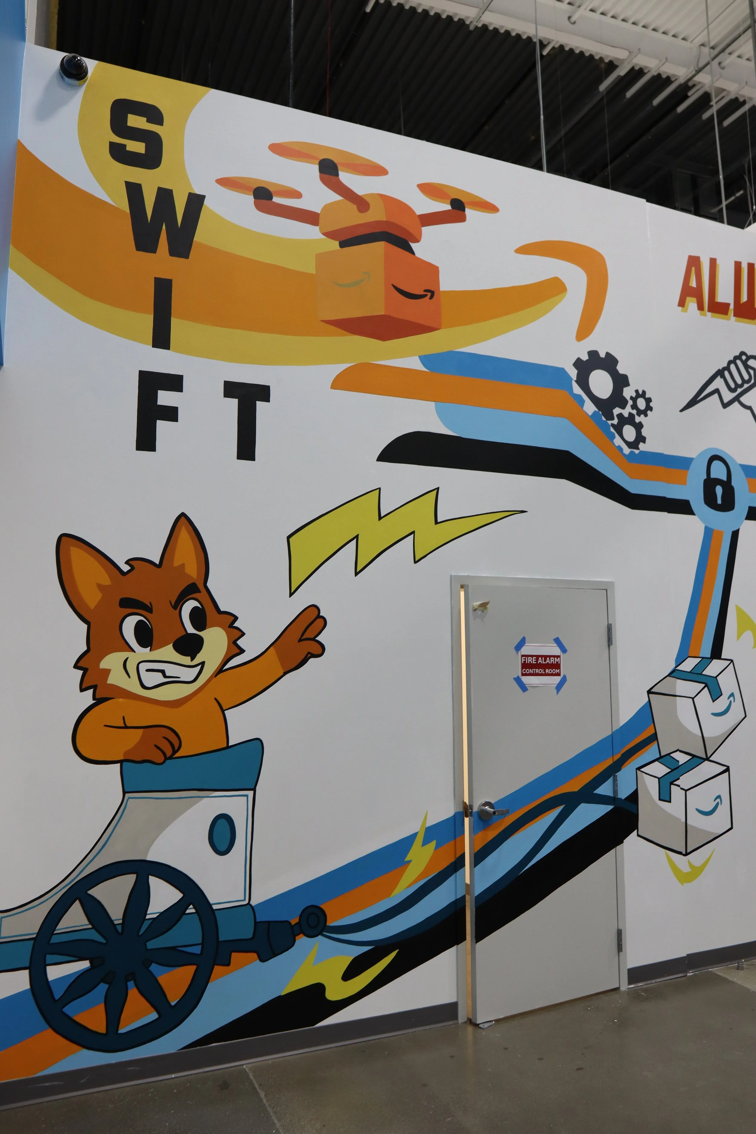 The design represents the values of this location, being smart, swift and ensuring your package is always safe. A pathway of its brand colors conenct these values together towards the middle where the shield resides. The almighty coyote character leads a charge towards the center on his chariot lead by amazon boxes.